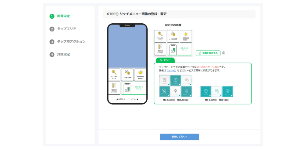 ステップごとに操作が分けられ、初心者の方でも迷わずリッチメニューを設定できます。
