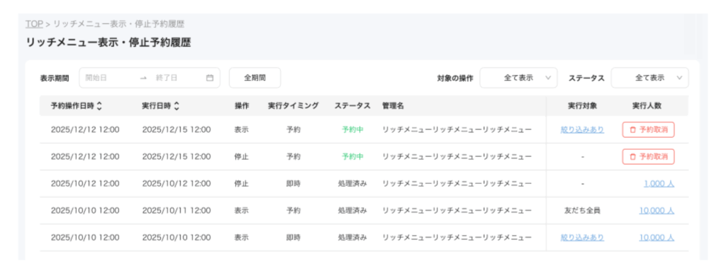 リッチメニューの表示・表示停止の履歴が確認できるようになります。