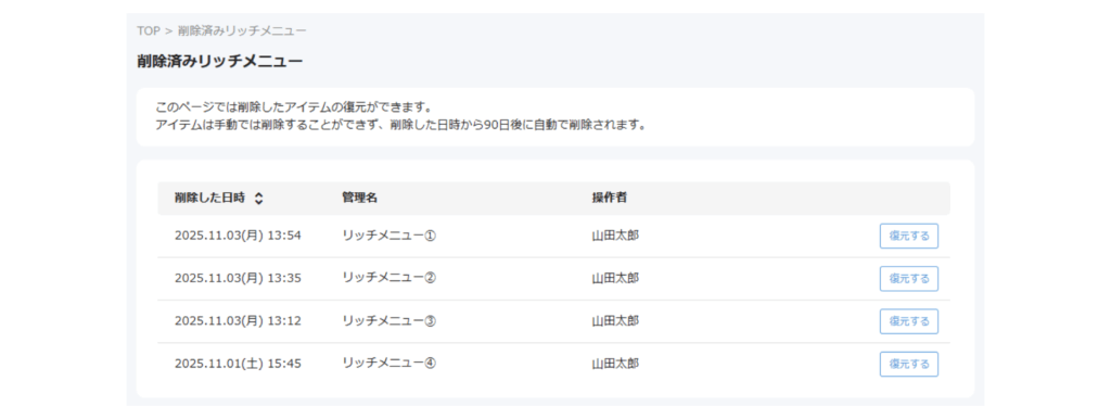 誤ってリッチメニューを削除してしまった場合でも、この一覧から簡単に復元することが可能です。