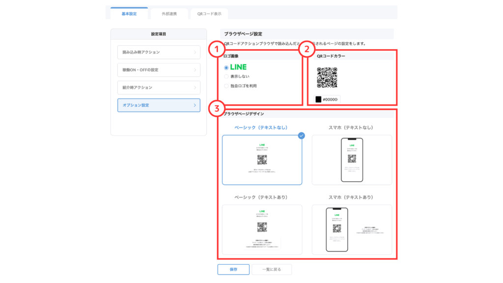 ブラウザページ設定では、QRコードアクションブラウザで読み込んだときに表示されるページの設定ができます。