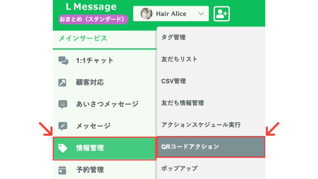 左側メニューより、「情報管理」にカーソルを合わせ、「QRコードアクション」をクリックします。