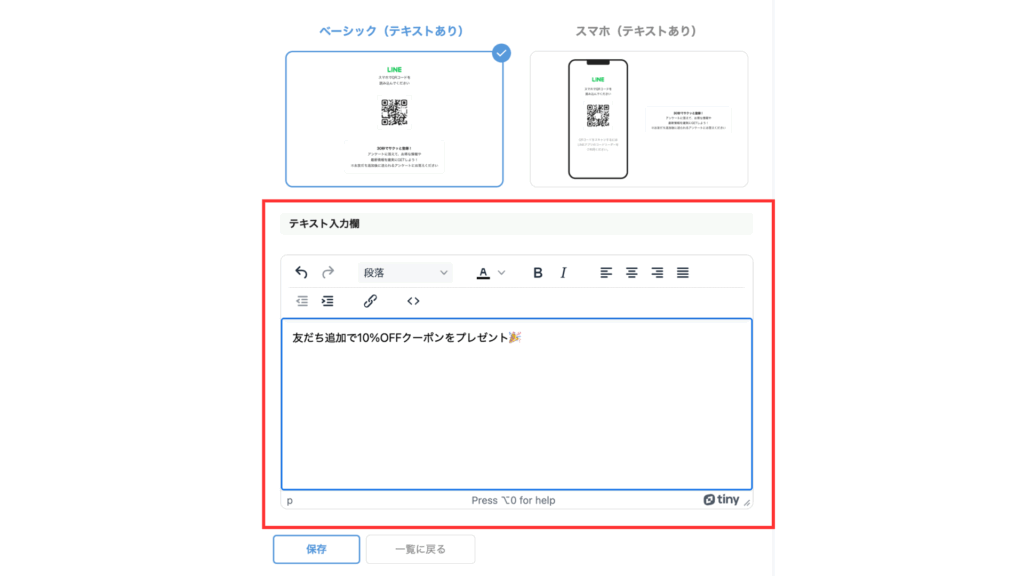 テキストありのデザインを選択した場合は、表示したい内容をテキスト入力欄に入力してください。