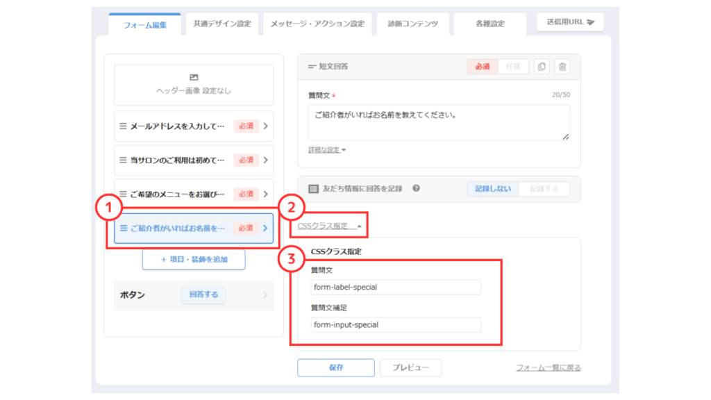 ③ 質問文と補足文に、それぞれ使用したいCSSクラス名を入力します。