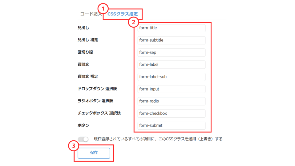 ② フォーム編集画面の下部にある 「CSSクラス指定」 をクリックします。