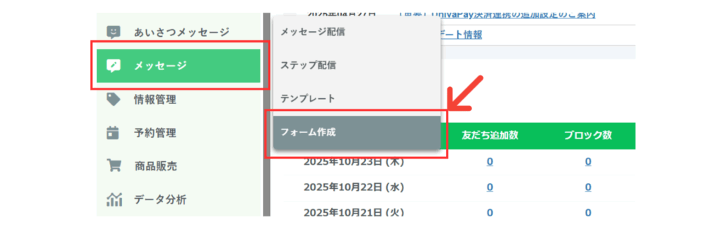 左メニューの「メッセージ」から「フォーム作成」をクリックします。
