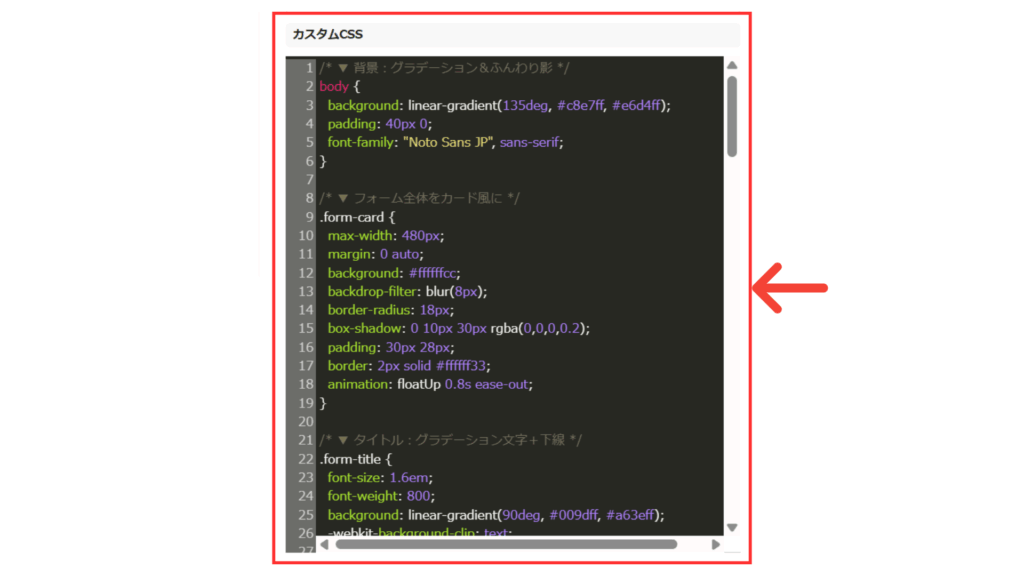 特定の質問に追加したクラスを反映させるために、先ほどの「共通デザイン設定」⇒「CSS・JS設定」から、コードを追記します。