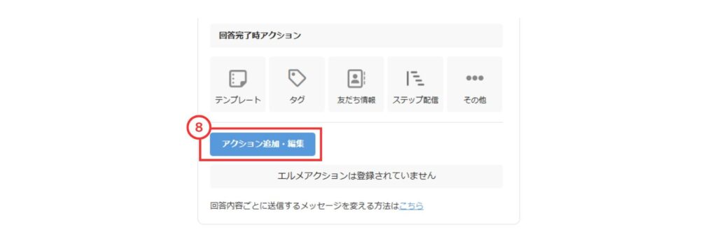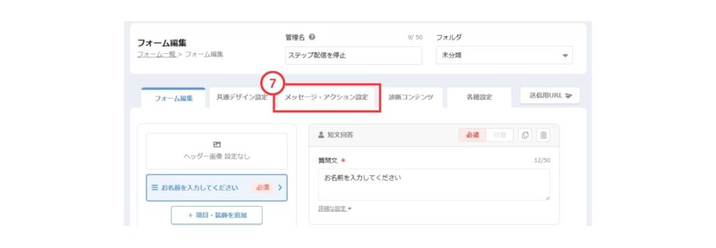 ⑦フォーム編集画面の「メッセージ・アクション設定」をクリック