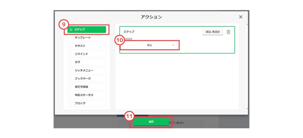 ⑨アクションメニューから 「ステップ」 をクリック