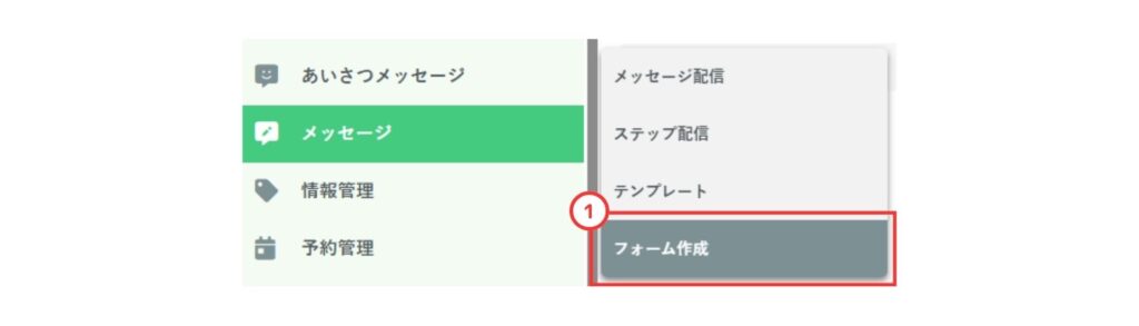 ①管理画面TOPの左メニューから 「メッセージ」 を選択し「フォーム作成」 をクリック