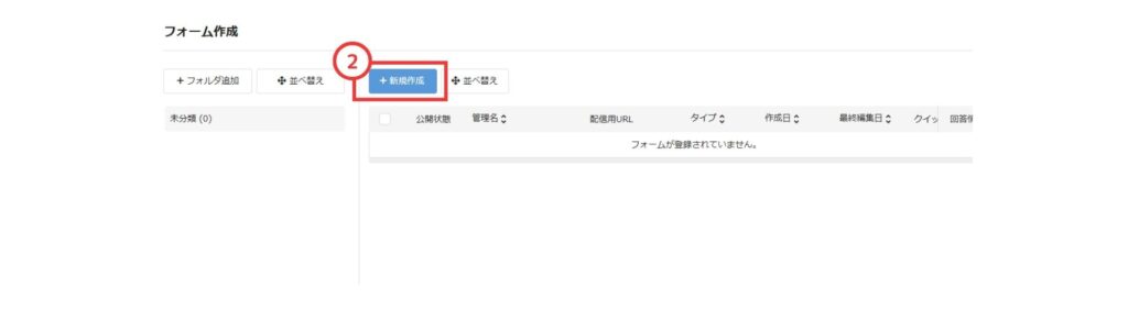 ②フォーム作成一覧画面の左上にある「新規作成」をクリック