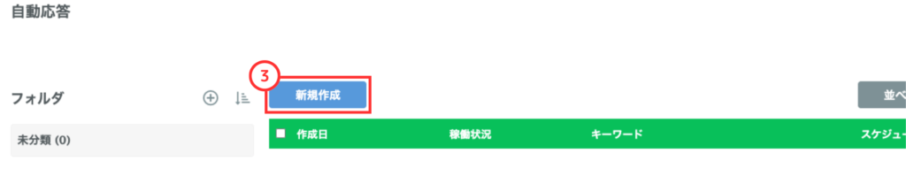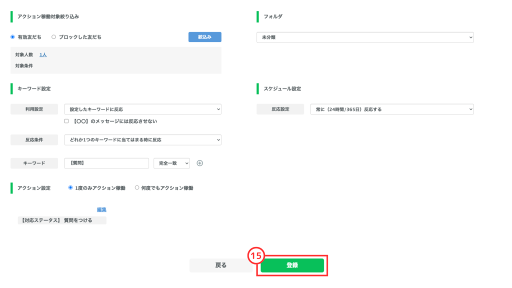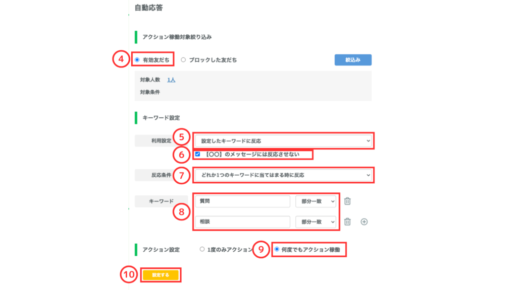 ⑧自動応答で反応させたい文言を「キーワード」に入力。