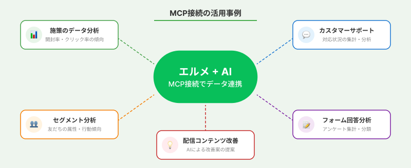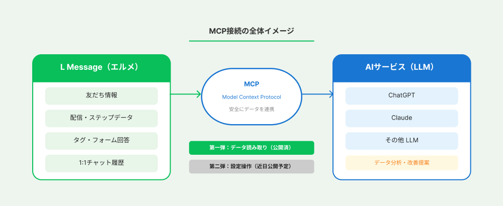 MCP(Model Context Protocol)とは、AIサービスが外部のツールやデータに安全にアクセスするための共通規格です。この規格を利用することで、エルメに蓄積された友だち情報や配信データなどを、AIに直接読み込ませて活用することが出来ます。
