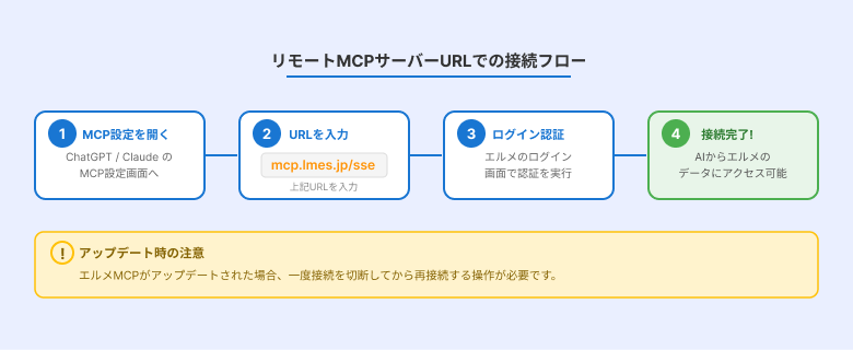 リモートMCPサーバーURLでの接続の場合、エルメMCPがアップデートされた際に自動更新が行われません。アップデートが行われた場合は、一度接続を切断してから再接続する操作が必要です。アップデート情報はお知らせにてご案内いたします。