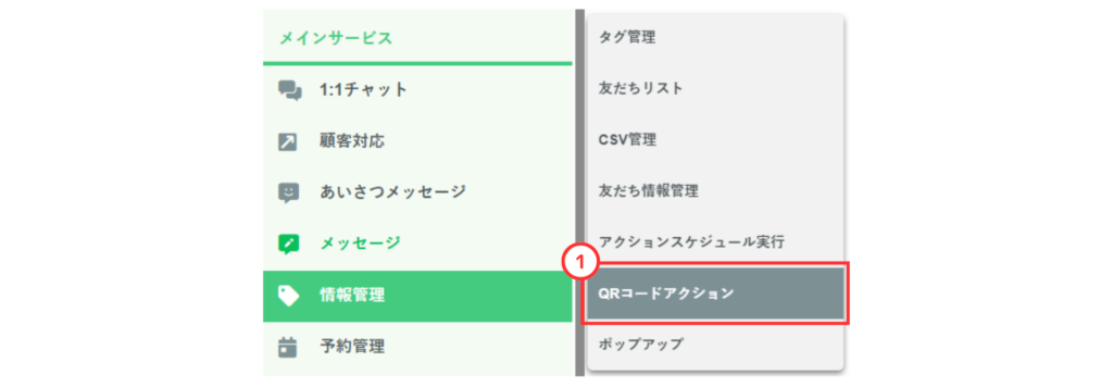 ①左メニューの「情報管理」にカーソルを合わせ、「QRコードアクション」をクリック