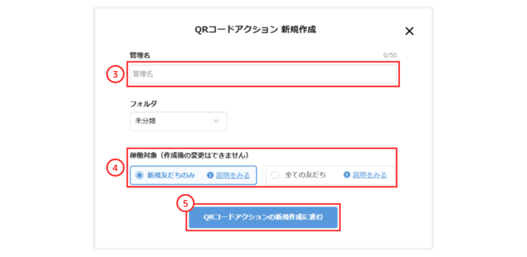 ⑤「QRコードアクションの新規作成に進む」をクリック
