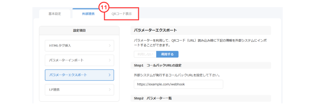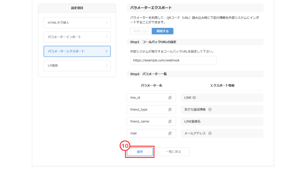⑧パラメーターエクスポートの「利用する」をクリック