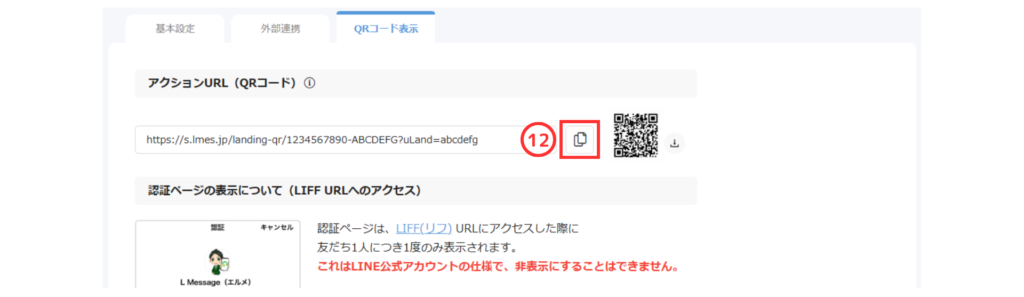 ⑫QRコードアクションURLのコピーボタンをクリック