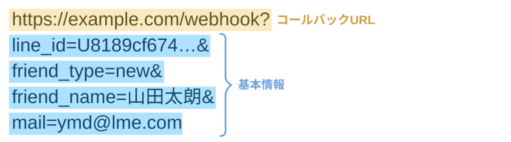 上記のようにパラメーターが付与されたコールバックURLに対して、エルメがGETアクセスを行うことで、外部システム側へ「LINE ID」「友だち追加情報」「LINE登録名」「メールアドレス」の情報が送信されます。