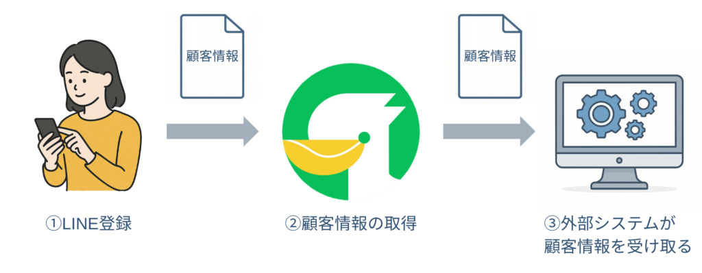 外部システムからコールバックURLを発行し、そのURLをエルメに登録することで、LINE公式アカウントに友だち追加が行われた際に、外部システム側へ顧客情報を自動で送信することが出来ます。