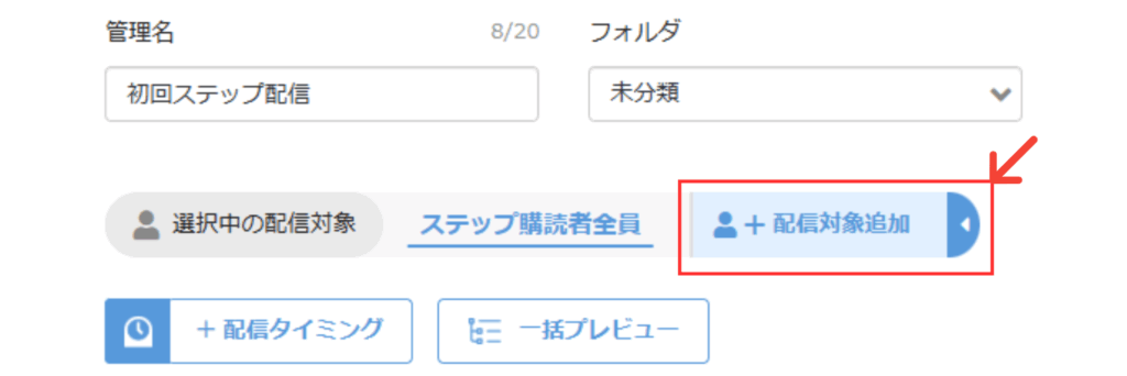 「+配信対象追加」のボタンから、配信対象を追加し、ステップ配信内に新しい配信対象を追加します。