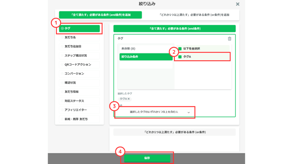 こちらの設定をすることで、例えば「タグAが付いている友だち」など、特定の条件に当てはまる友だちに対してのみメッセージを送信する事が可能になります。
