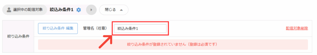 「絞り込み条件 編集」ボタン横の「管理名」から配信対象名の設定をすることができます。