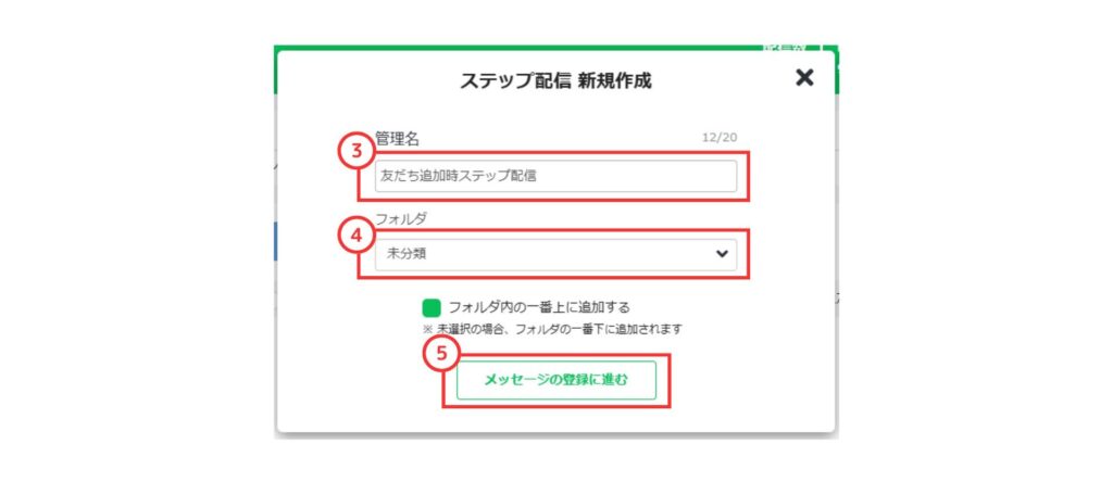 「フォルダ内の一番上に追加する」をクリックすると、作成したステップ配信をフォルダ内の最上部に配置することができます。