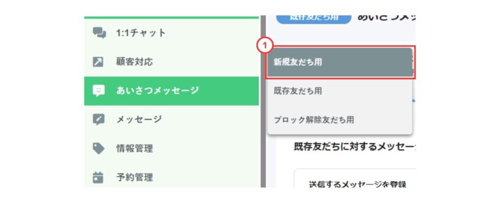 ①管理画面の左メニュー「あいさつメッセージ」を選択し「新規友だち用」をクリック