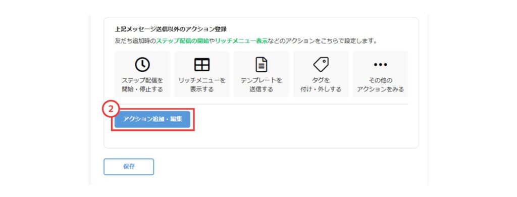 ②あいさつメッセージ設定画面下部の「アクション追加・編集」をクリック