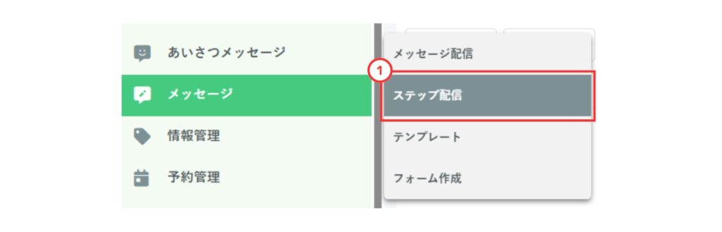 ①管理画面の左メニューにある「メッセージ」を選択し「ステップ配信」をクリック