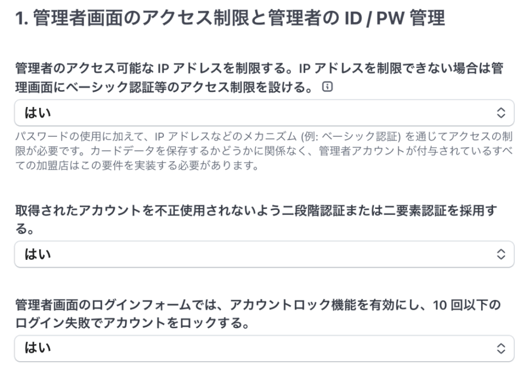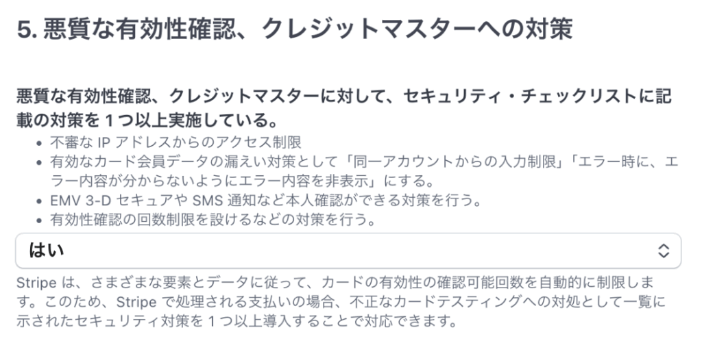 Stripeでは、2024年4月1日以降に作成された新たなStripeアカウントを対象にセキュリティチェックリストの記入が必須となりました。以下に回答例を記載いたしますのでご確認ください。なお、ご不明な点がございましたらStripe社までご確認ください。