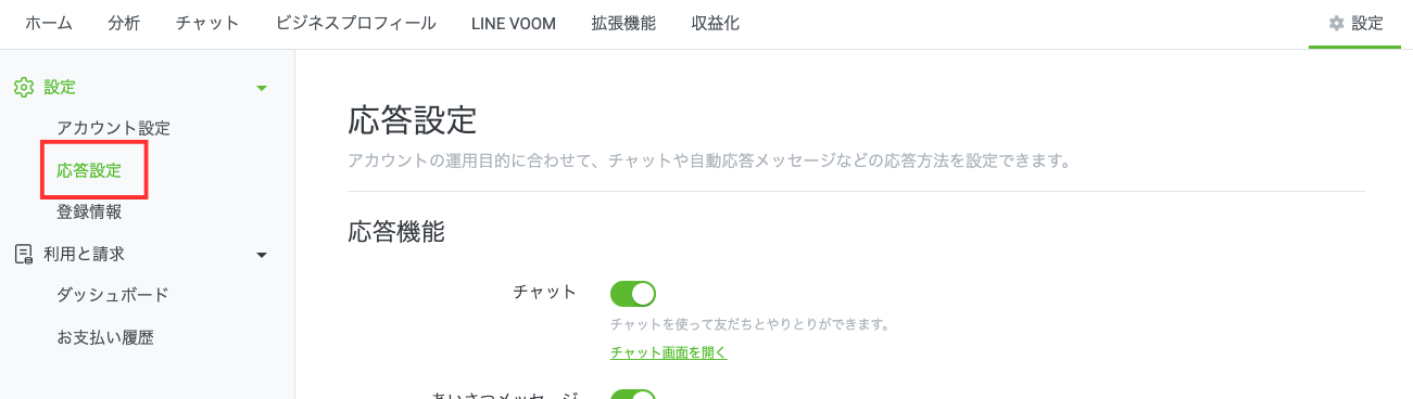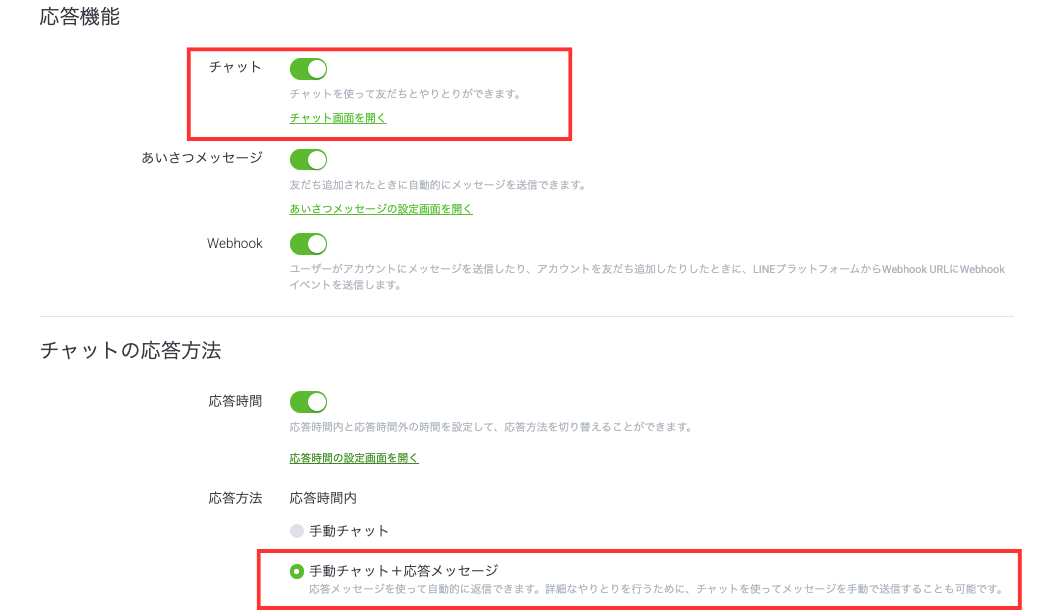 チャット機能を利用せずに応答メッセージのみを利用する場合は、「チャット」をオフに、「応答メッセージ」をオンにして設定完了です。