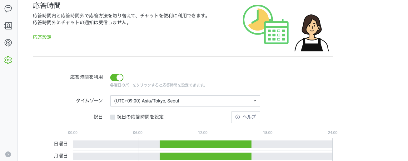 応答時間とは、チャットで個別に対応できる時間帯のこと。いわゆる営業時間と同じようなイメージです。