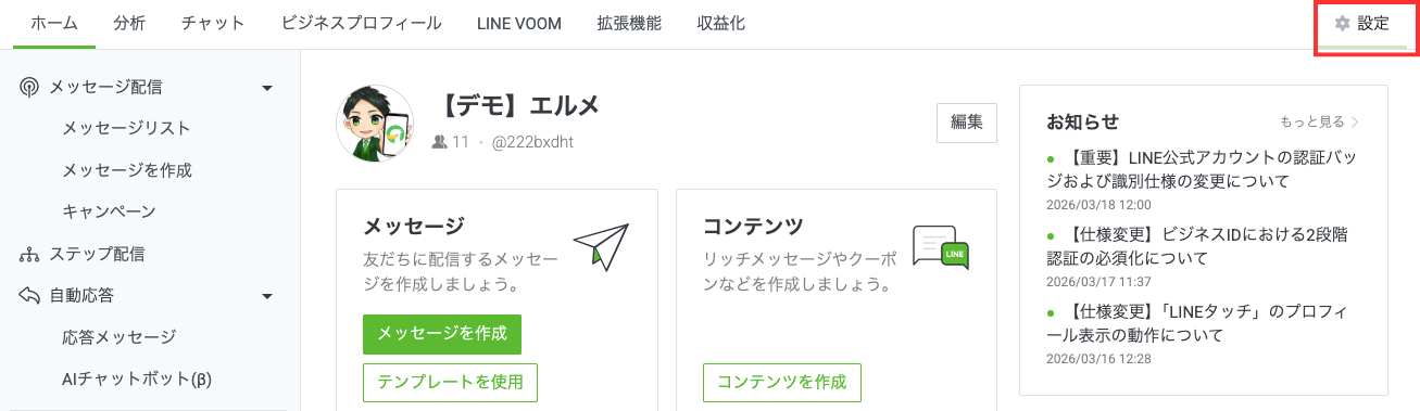 まず、LINE公式アカウントのビジネスマネージャーにログインし、管理画面右上の「設定」をクリックしてください。