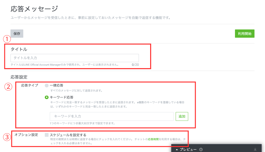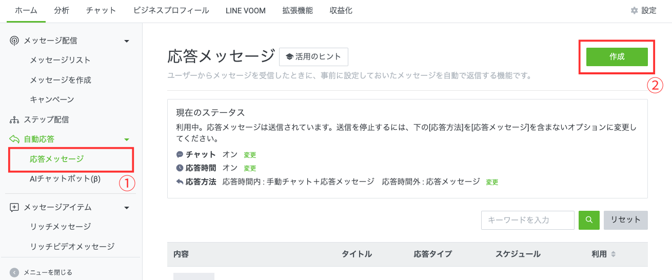 まずは、LINE公式アカウントの管理画面で応答メッセージを作成します。