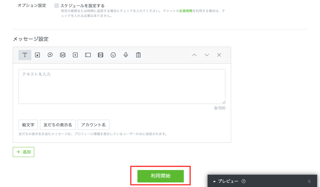 「メッセージ設定」からメッセージの内容を入力し、「利用開始」ボタンを押して設定完了です。