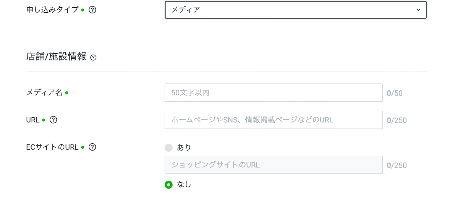• 入力項目: メディア名、URL、ECサイトの有無。