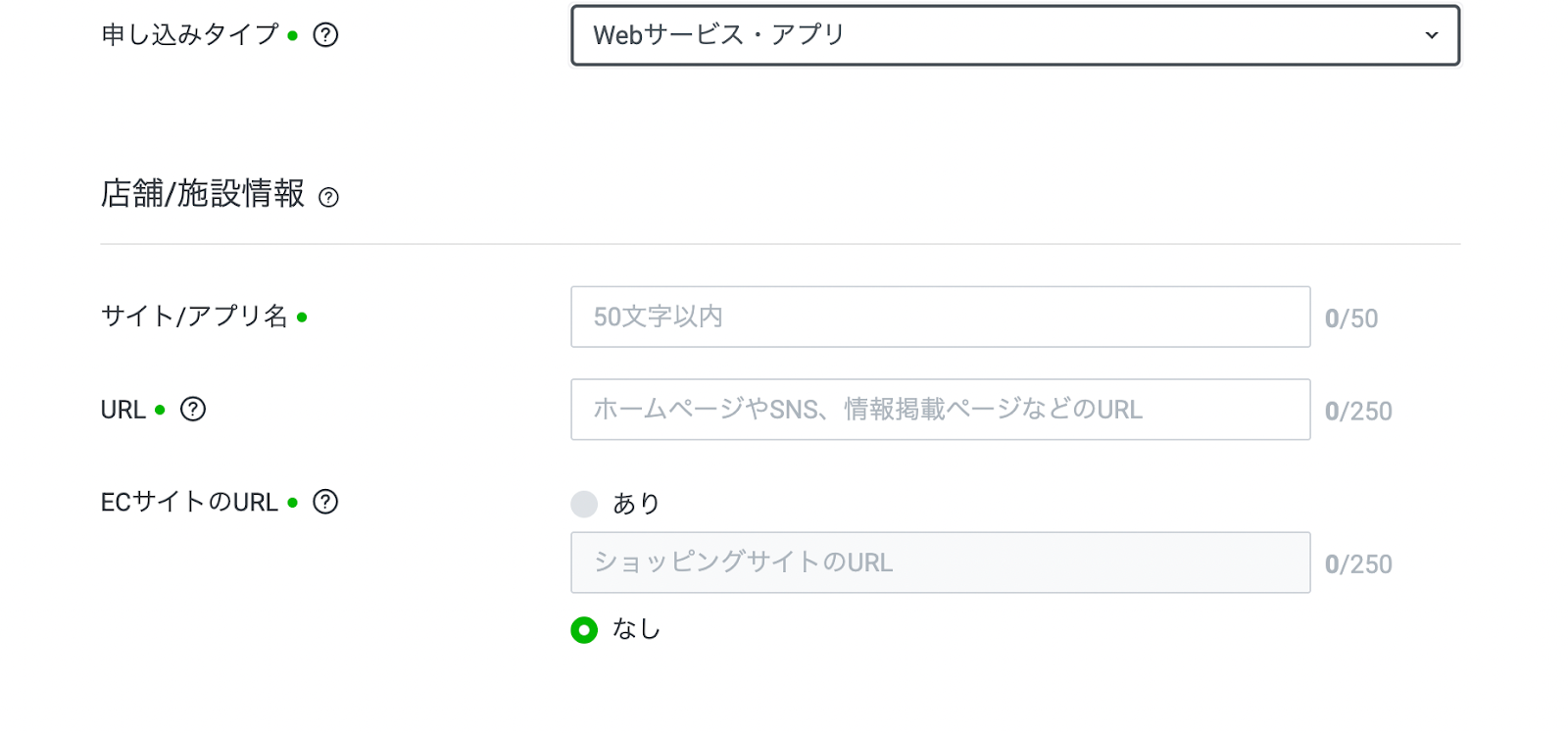 • 入力項目: サイト/アプリ名、URL、ECサイトの有無。