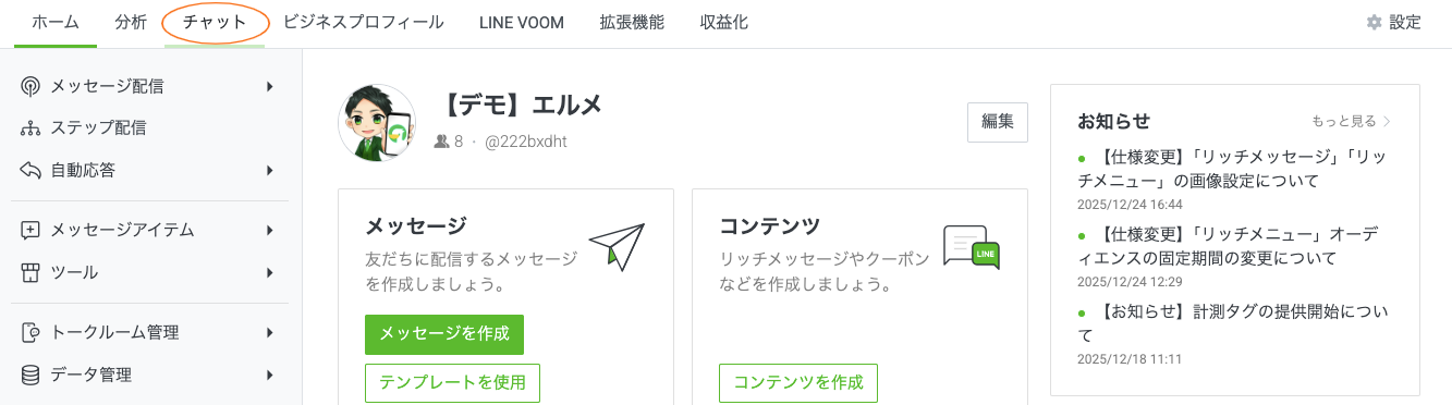 まず、LINE公式アカウントにログインし、メニューから「チャット」をクリックしてください。