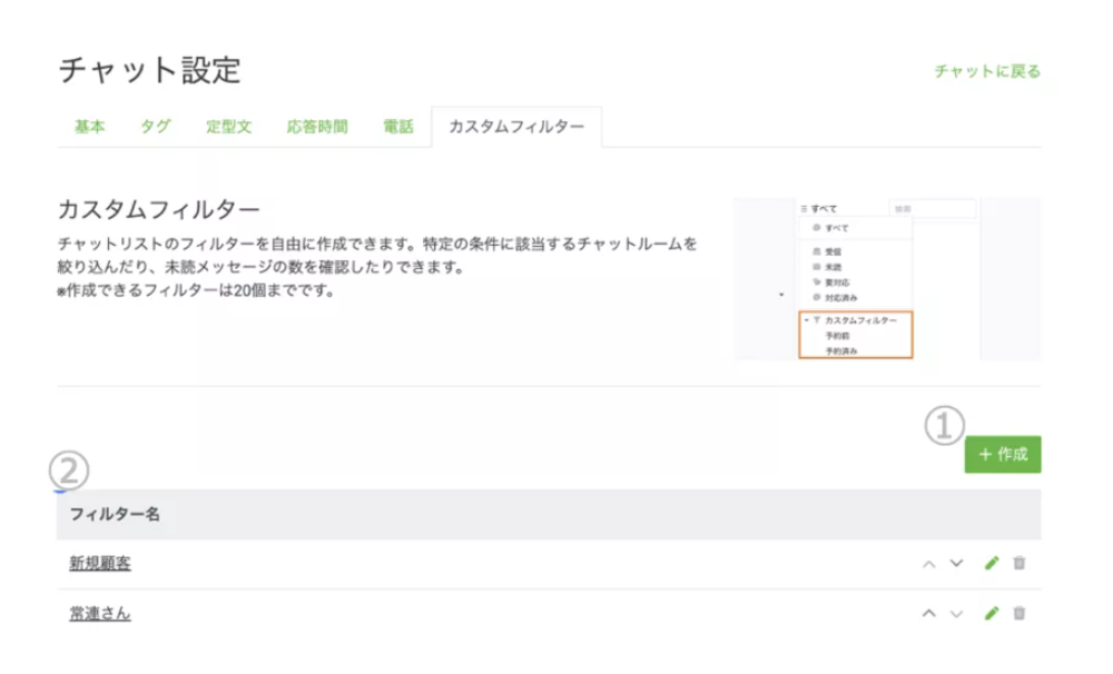 画面右下にある緑色の「+作成」ボタンから、チャットリスト用のカスタムフィルターを自由に新規作成できます。