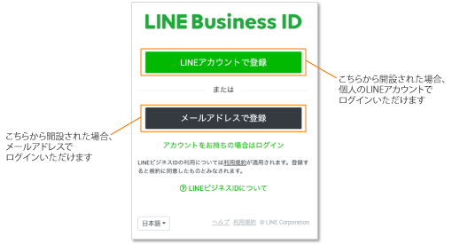 • デスクトップでLINE公式アカウントにログインする方法は、「LINEアカウント」と「ビジネスアカウント」の2つがある