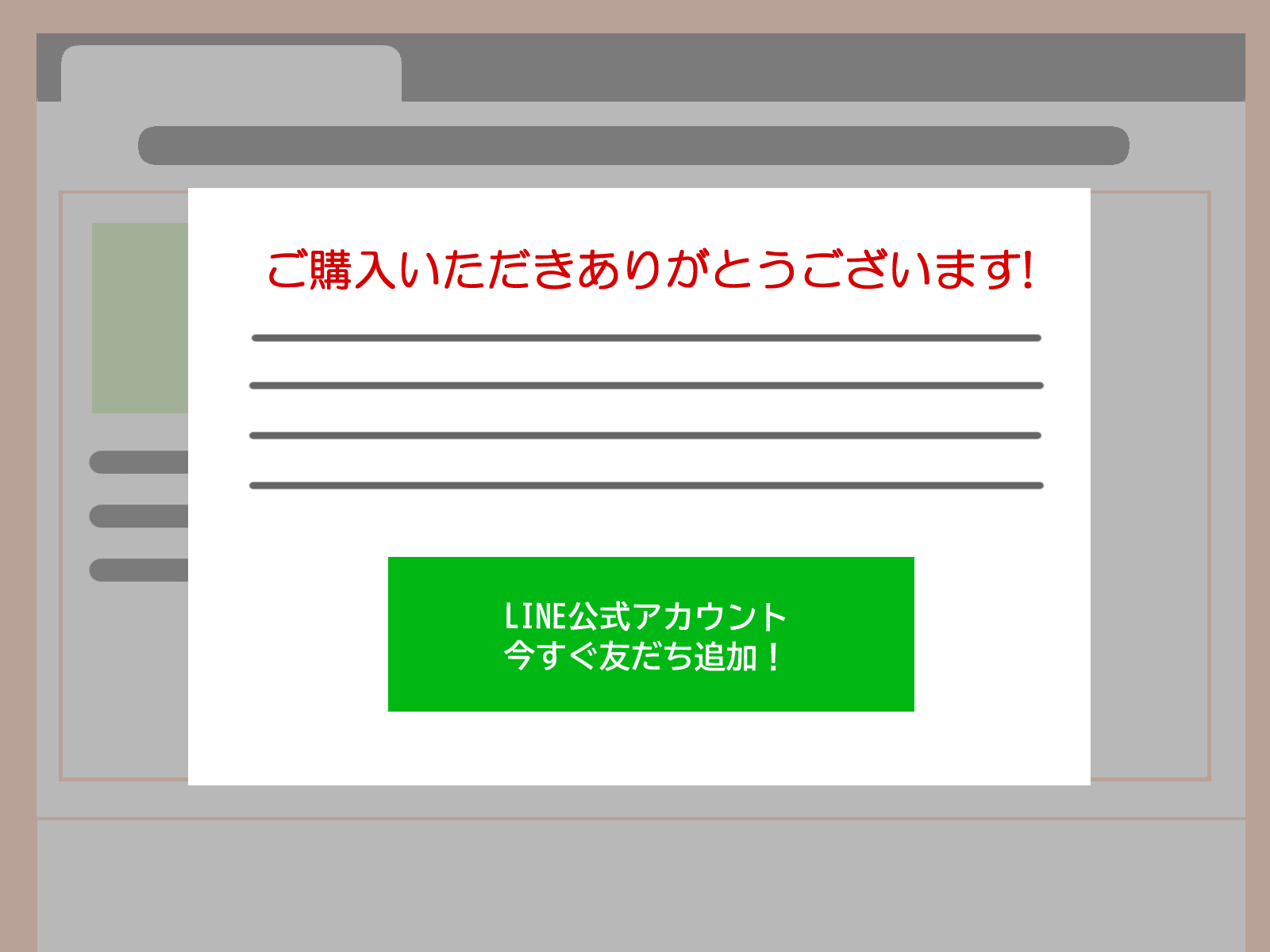 サンクスページでは「お問い合わせありがとうございます。今後のお得な情報はLINEでお届けします」「ご購入ありがとうございます。次回使えるクーポンをLINEでプレゼント」など、感謝の気持ちと共に特典を提示すると効果的です。