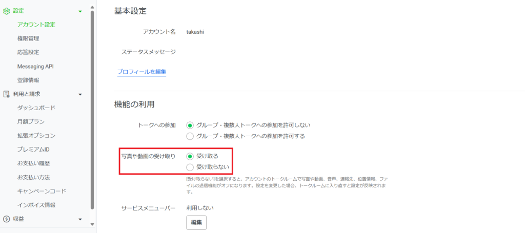 具体的には、LINE公式アカウントの管理画面内で「写真や動画の受け取り」がオフ(受け取らない)になっていると、ユーザーが画像を送信しても受信できません。