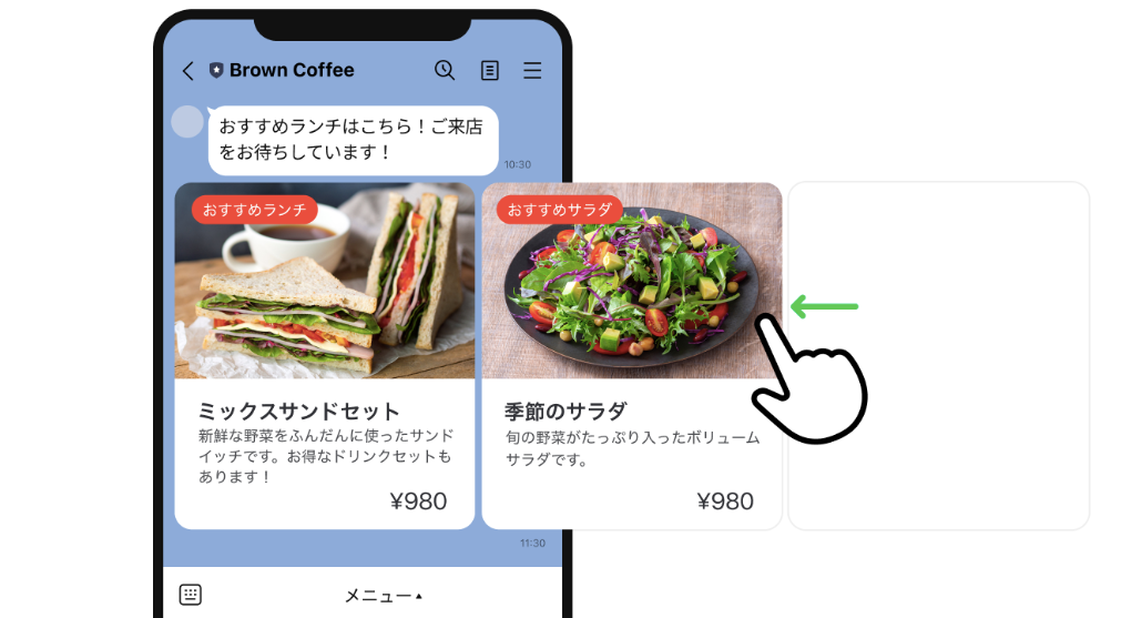 カードタイプメッセージは、画像・テキスト・ボタンを1つのカードとしてまとめ、それを横にスライドしながら閲覧できる形式のメッセージです。