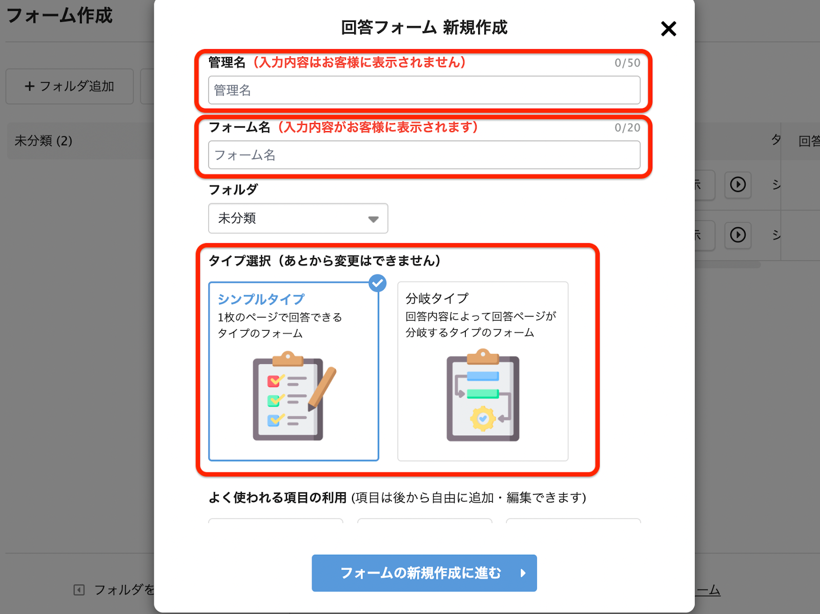 ご自身で管理する用のフォーム名と、LINE上で公開されるフォームのタイトルを入力し、作成したいフォームのタイプを選択します。