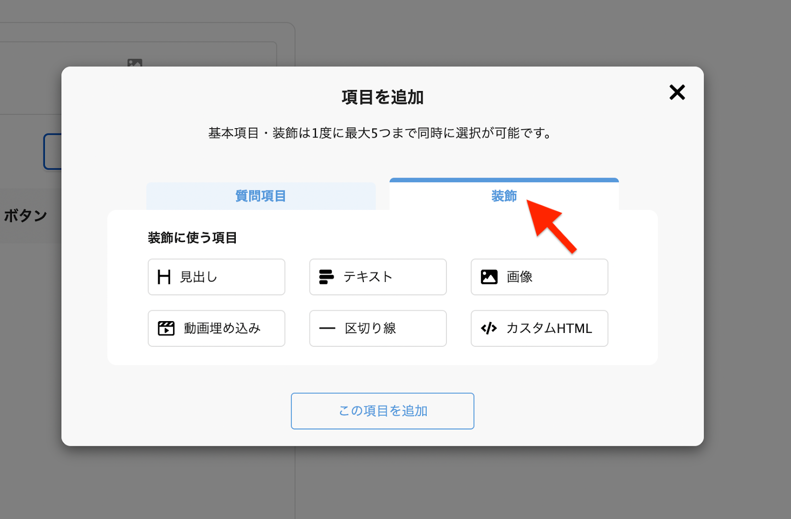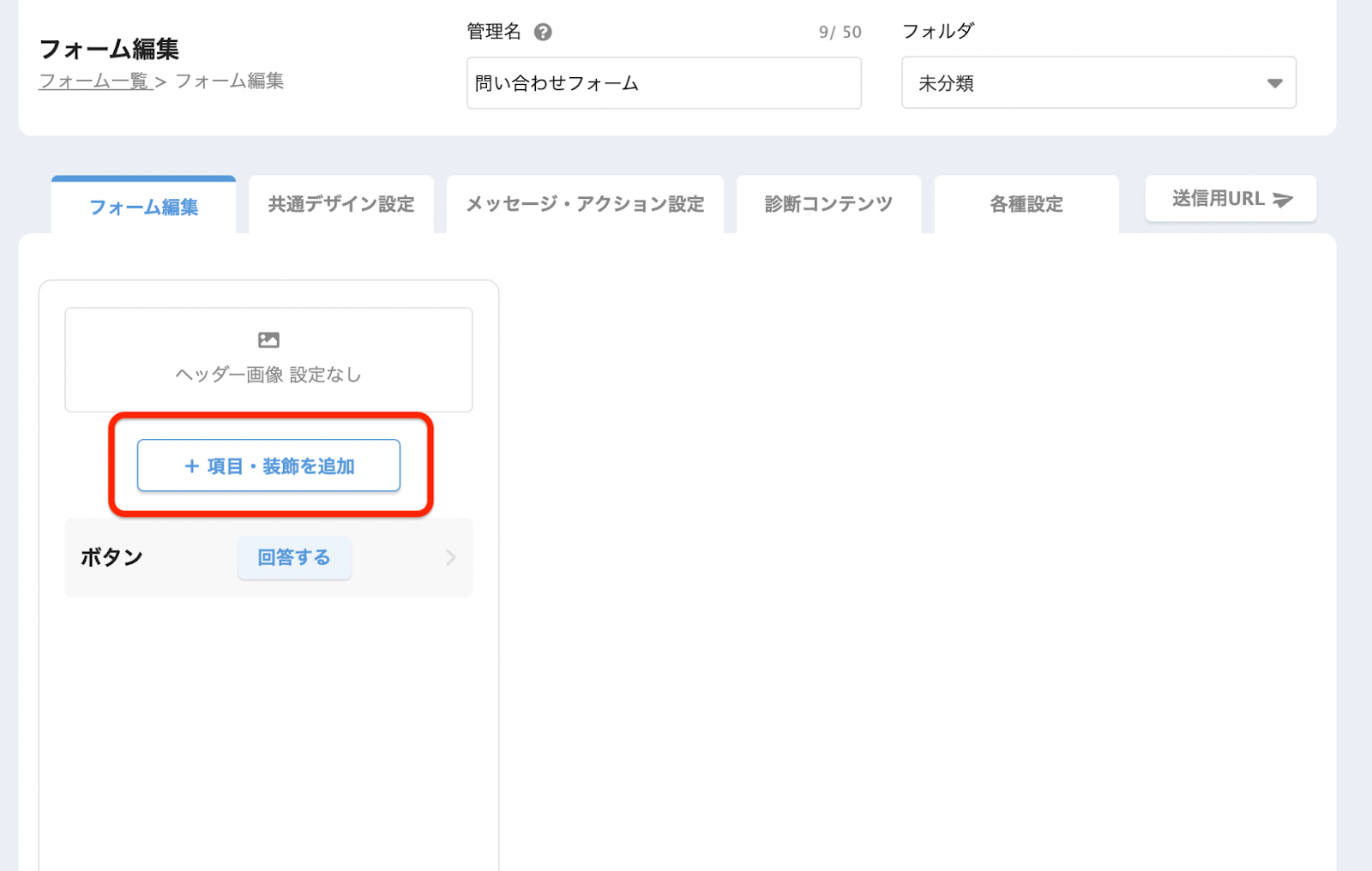 「+項目・装飾を追加」をクリックして問い合わせフォームの項目を作成します。