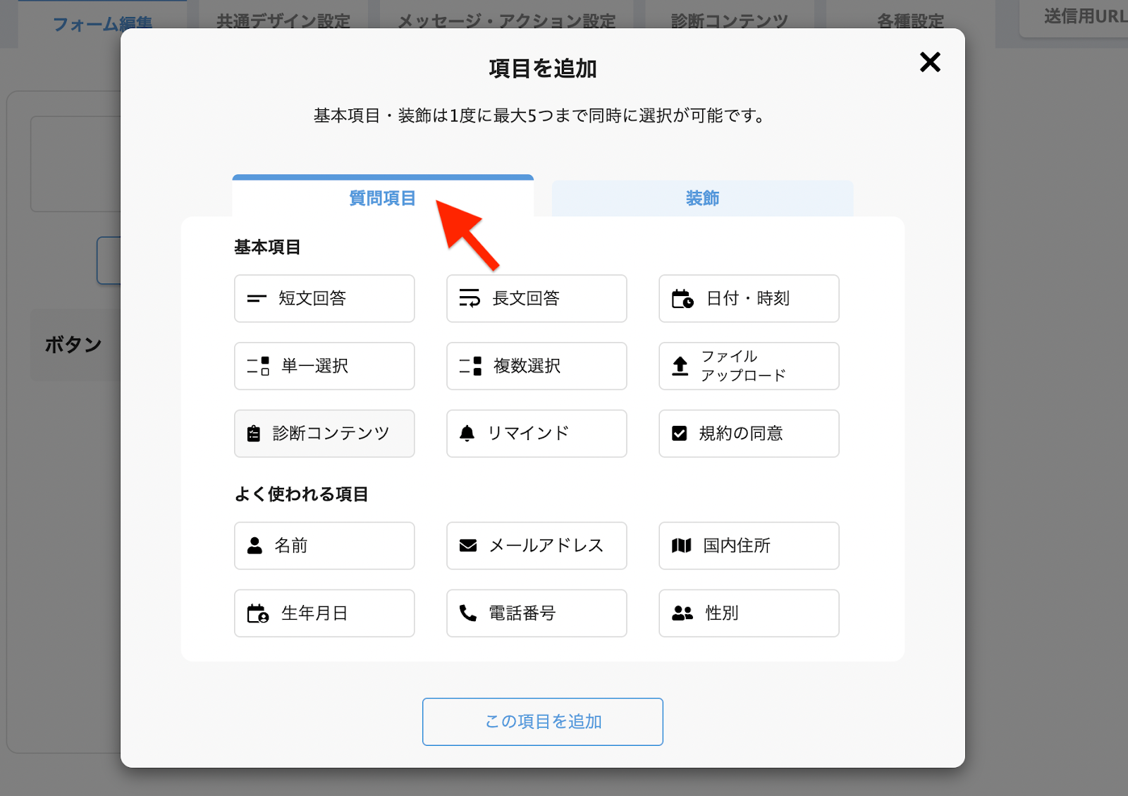 問い合わせフォームのタイトルや説明文は「装飾パーツ」、ユーザーに入力・選択してほしい項目は「質問事項」よりパーツを追加すると良いでしょう。