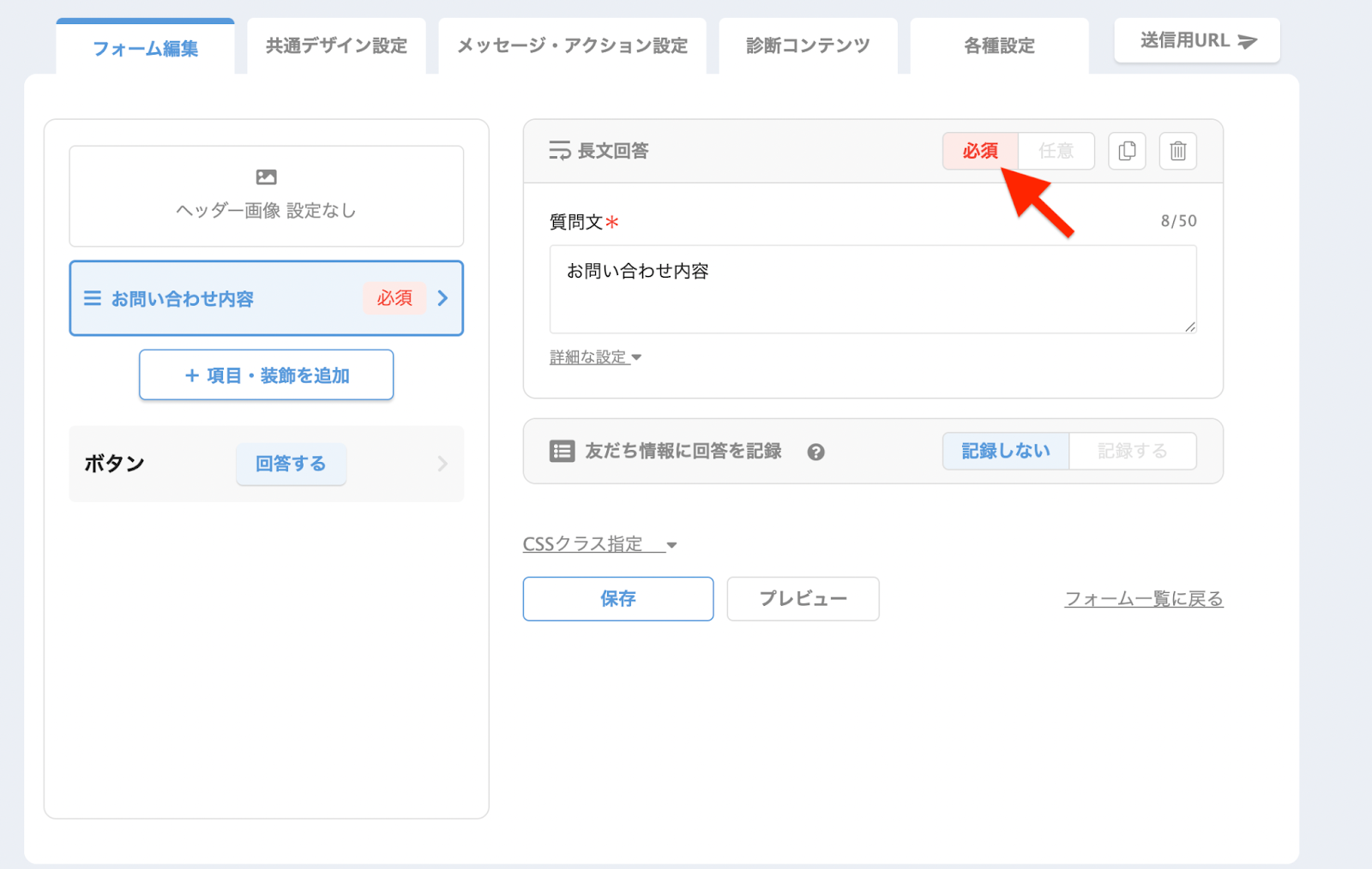 必ず入力してほしい項目には「必須」のチェックを入れておきます。