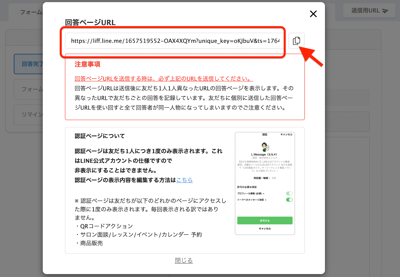 あとは「送信用URL」をクリックして「回答ページURL」をコピーします。