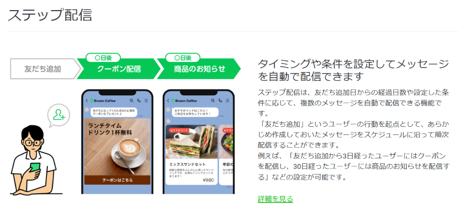 ステップ配信とは、友だち追加を起点として、あらかじめ設定したメッセージを段階的に配信できる機能です。配信内容と配信間隔を事前に決めておくことで、毎回手動でメッセージを送る必要がなくなり、運用の手間を減らせるでしょう。
